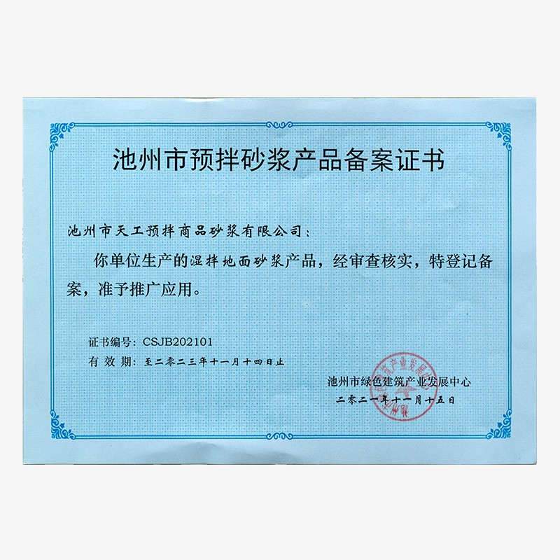 池州市預拌砂漿產品備案證書-濕拌地面砂漿